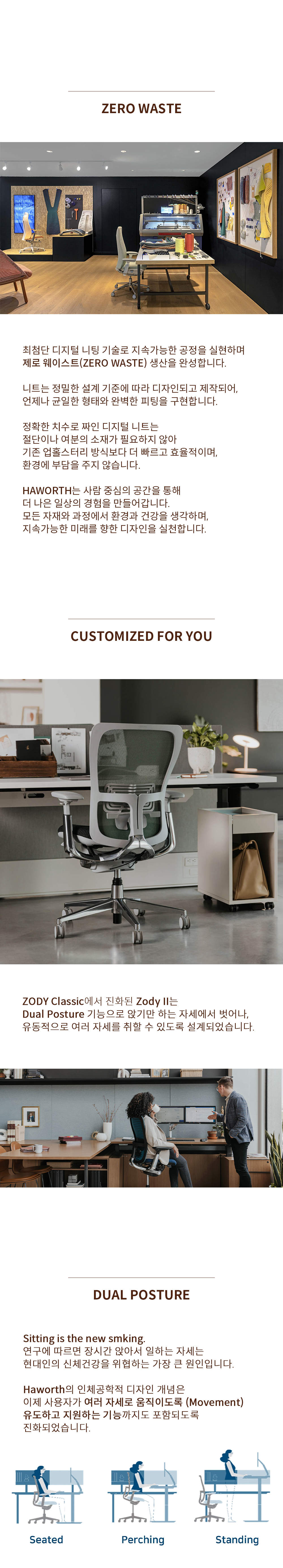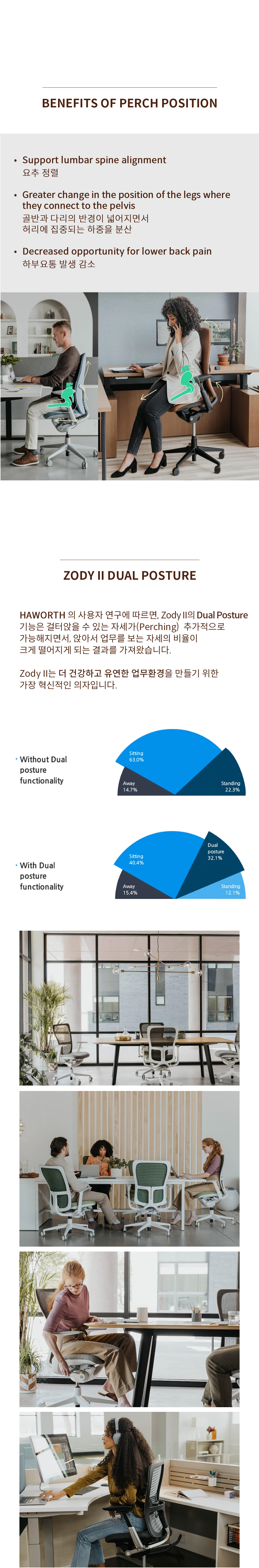 Zody II는 하루종일 앉기만 하는 자세에서 벗어나, 유동적으로 앉고, 걸터앉는 다양한 자세를 취할 수 있도록 디자인 된 높이조절책상에 가장 이상적인 의자입니다.